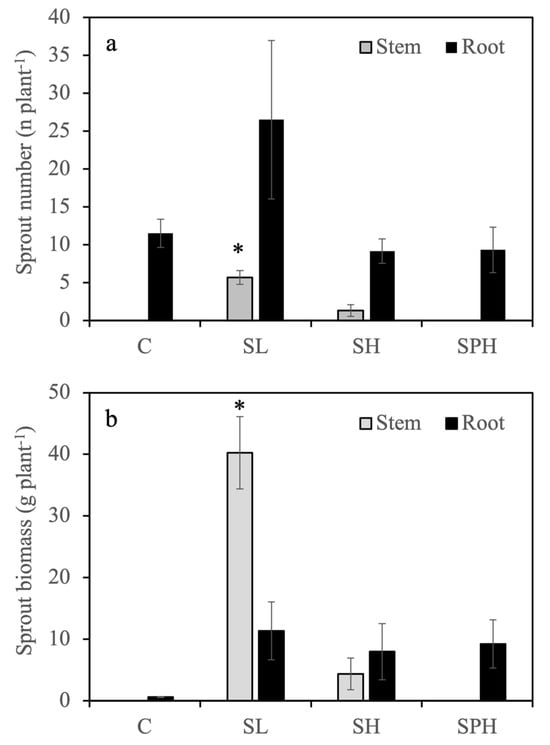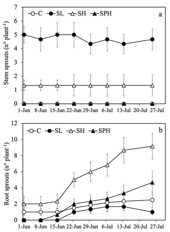 Number of stem (a) and root (b) sprouts produced from the removal of the covers (1 June 2022) up to the peak of the first growth season (25 July 2022), as affected by the treatments. C, not-cut controls; SL, stems cut and exposed to the light; SH, stems cut and covered; SPH, stems cut and the entire pot covered. Error bars denote the SEs (n = 6).