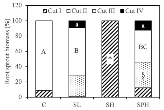 Percent partitioning of the cumulative biomass of root sprouts within the four sprout cuts, as affected by the treatments. C, not-cut controls; SL, stems cut and exposed to the light; SH, stems cut and covered; SPH, stems cut and the entire pot covered. Within each cut, different fonts or symbols indicate the statistical difference between the treatments at p ≤ 0.05 using Tukey’s test. Missing fonts or symbols are different from those reported.