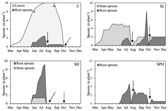 At cut II, the stem sprouts were present only in SL and their total and unitary biomass were greatly reduced compared with cut I, while the root sprouts were produced only in SL and SPH, with approximately 3 g plant−1 in both (Table 3). Thus, at the end of the first growth season, the cumulative biomass of the sprouts was significantly higher in the cut stems exposed to the light (43.8 g plant−1) than in the other treatments, in which it was 12.4 g plant−1 in SH, 4.2 g plant−1 in SPH, and only 0.06 g plant−1 in the control plants. The treatments also differed in the partitioning of the biomass within the stem and root sprouts, as over 90% of the biomass was allocated in the stem sprouts in SL and 35% in SH, while SPH and C produced root sprouts only.