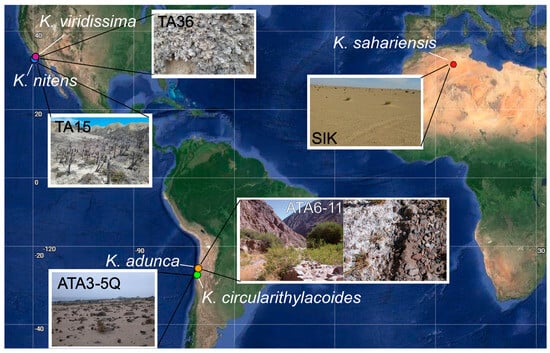 The samples originating from San Nicolas Island were collected on 25 May 2021 as part of a larger biodiversity study, and the details of the sampling effort have been previously reported elsewhere in detail [14]. The sample containing K. nitens specifically (TA15) consisted of biological soil crust collected from just above a natural spring near sea level and with sparse vascular plant cover (33.230701, −119.518852, Figure 1). The sample containing K. viridissima was collected from a highly developed, blackened, rugose, and pedicled BSC (Figure 1) sample from the bottom of a north-facing canyon (33.26033, −119.48643). The sample containing K. circularithylacoides was collected in the Atacama Desert on 13 May 2009 from a sandy soil sample found underneath quartz rocks near lichen-covered cacti (−27.783889, −71.034722, 9 m above sea level). Further details on this sampling effort have been previously reported [17,31]. The sample containing K. sahariensis was collected in December 2018 from the Sidi Khouiled (SIK) sampling site in the Sahara Desert in northeastern Algeria (31.994389, 5.415139) on a quaternary alluvial terrace with a slight slope. Additional strains representing the species were also collected in December 2018, but from a dried saline lake bed (a “chott”) in the Oued Souf area (33.717861 N, 7.441167 E) of the Sahara Desert in Algeria. These last samples were collected as part of studies on hypolithic and biocrust cyanobacterial communities in the Sahara Desert, and additional details on the methods and sampling sites have been previously reported elsewhere [22,32].