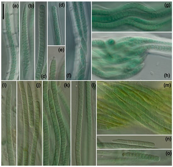 Photomicrographs of species from San Nicolas Island. (a–h) K. nitens and (i–o) K. viridissima. Scale bar = 10 μm, applies to all panels. (a–e) Single-trichome filaments of K. nitens showing variation in apical cell and sheath morphology. (f) Multiple-trichome filament with hormogonia formation. (g) Characteristic wavy filament with multiple trichomes. (h) Nodule formation along a multiple-trichome filament. (i–k) Filaments of K. viridissima showing the characteristic green color and variation in apical cell morphology. (l) Characteristic sheath of K. viridissima. (m) Ropelike twisted bundle of multiple trichomes. (n,o) Hormogonia.