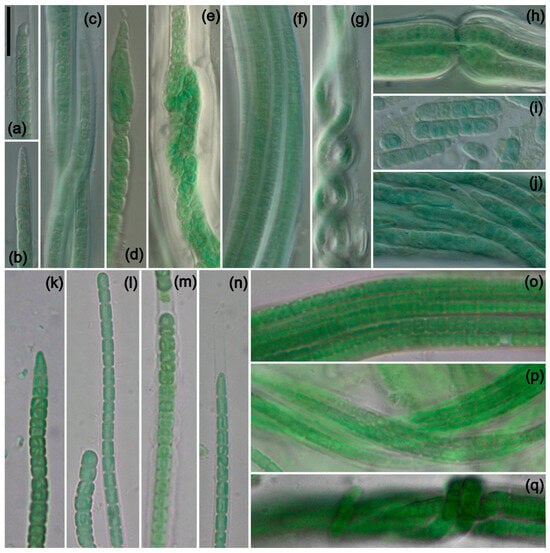 Photomicrographs of species from South America and Africa. Scale bar = 10 μm, applies to all panels. (a–i) K. circularithylacoides. (k–q) K. sahariensis. (a) Filament with sheath extending beyond trichome, with hook-shaped apical cell characteristic of the genus. (b) Conical apical cell. (a–c,j) Various filaments with characteristic circular formations formed by thylakoids. (d) Rare and unusual enlarged cell near apex of trichome. (e,h) Nodule formation with wide and lamellated sheath. (f) Multiple-trichome filament. (g) Helix formed by twisting of a filament. (i) Hormogonia. (k–n) Trichomes of K. sahariensis showing morphological variation in vegetative and apical cells. (m) Thick sheath with undulated edges. (n) Thin sheath extending beyond trichome. (o–q) Variation in filaments with self-knotting visible in (q). (a–h) Strain ATA3-5Q-CV5. (i,j) Strain ATA3-5Q-LB5. (k,m,q) Strain SIK64. (l,n) Strain SBC72. (o,p) Strain SIK77.