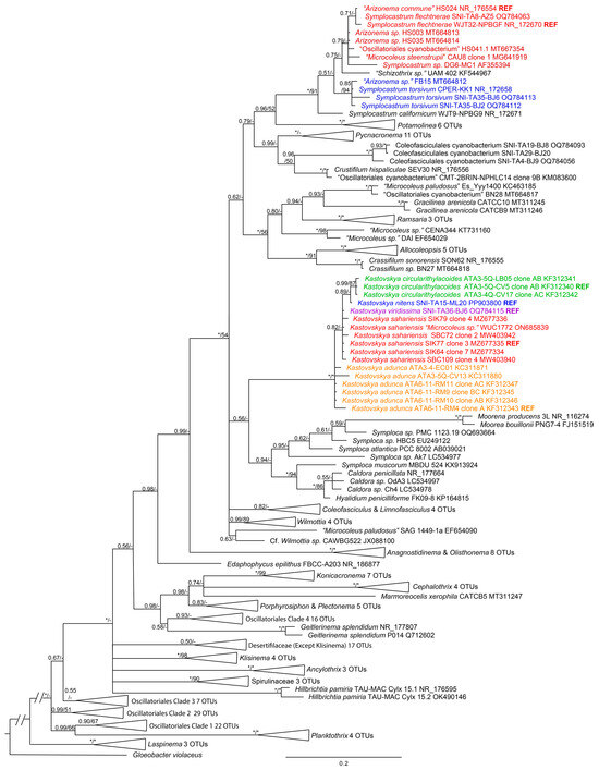 - Moreira-Fernandes, V.; Giraldo-Silva, A.; Roush, D.; GarciaPichel, F. Coleofasciculaceae, a monophyletic home for the Microcoleus steenstrupii complex and other desiccation tolerant filamentous cyanobacteria. J. Phycol. 2021, 57, 1563–1579. [Google Scholar] [CrossRef]