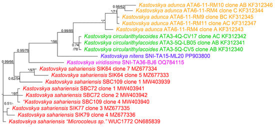 Bayesian inference (BI) analysis based on 16S–23S rRNA internal transcribed spacer gene sequence alignment of 19 taxa in genus Kastovskya, with posterior probability and maximum parsimony (MP) bootstrap support values superimposed on nodes. Full nodal support (1.0 BI, 100 MP) is indicated by (*). Support below 0.5 BI and 50 MP is indicated by (-). Strains in same color font are the same species.