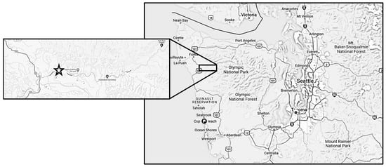 Our study was conducted in the Hoh Rainforest just outside the entrance to the Olympic National Park in the Hoh River valley, Washington, USA (47°52′15″ N, 123°55′52″ W; Figure 1). The site is a flood plain along the Hoh River dominated by large bigleaf maples (Acer macrophyllum) with scattered Sitka spruce (Picea sitchensis) in the overstory and vine maple (Acer circinatum) and western sword fern (Polystichum munitum) in the understory. The climate is mild and wet, with temperatures fluctuating between −7 and 21 °C (average temperature: 10 °C) and the average precipitation fluctuating between 320 and 344 cm [39,40]. Within this temperate rainforest, Acer macrophyllum trees support more epiphyte biomass than any other tree in the Pacific Northwest, and the biomass of epiphytes can be four times that of their host tree’s foliage [41]. Therefore, Acer macrophyllum was selected as the focal host species for this study.