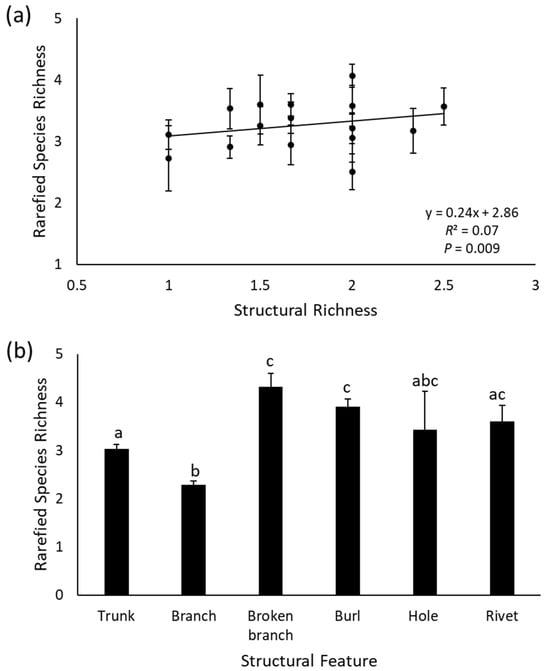 There was a positive effect of structure on rarefied species richness of epiphytes in Acer macrophyllum. (a) An increase in structural richness on the trunk led to a corresponding increase in rarefied species richness of epiphytes (p = 0.009). (b) Average (±SE) rarefied species richness of epiphytes also varied among structural features (p = 0.001) and was lowest on branches and bare trunks. Bars with different letters are significantly different from each other according to a Tukey’s HSD test (p < 0.05).