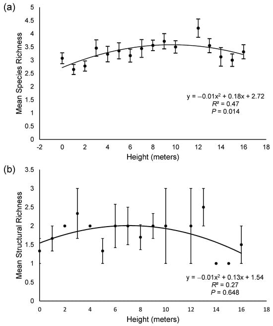 Mean rarefied species richness (a) and structural richness (b) of epiphytes with height in Acer macrophyllum (n = 3). (a) Points represent average (±SE) rarefied epiphyte species richness with height (p = 0.014). (b) Points represent average (±SE) structural richness with height (p = 0.648).