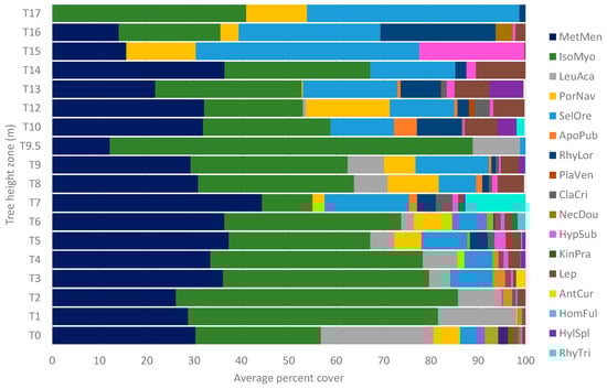Species varied in their percent covers along the trunks with height in the trees (Figure 4). Metaneckera menziesii and Isothecium myosuroides were found in almost equal abundance across all heights on the trunk (Figure 4). Leucolepis acanthaneuron occurred on the lower parts of the trunk, while Porella navicularis, Selaginella oregana, Rhytidiadelphus loreus, and Hypnum subimponens occurred higher up the trunk (Figure 4).