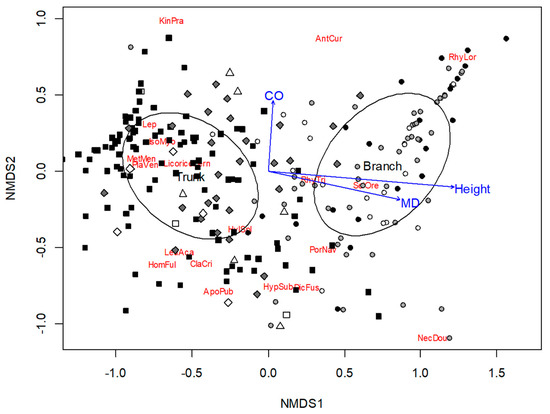 Non-metric multidimensional scaling ordination (NMDS) of epiphyte species composition by structural features of trunks (i.e., trunks (black squares), burls (gray diamonds), broken branches (white triangles), holes (white squares), and rivets (white diamonds)) and branches (i.e., tops (black circles), sides (gray circles), and bottoms (white circles)). The Marista–Horn similarity index was used on abundance data. Ellipses show the covariance matrix centered on the mean of each structure; overlapping ellipses indicate similar species composition. Two-dimensional stress = 0.16, Monte Carlo stress with 1000 iterations = 0.26. Species codes are shown in red (see Table 1 for species codes). Environmental variables are shown as blue vectors. Bryophyte depth (MD, r2 = 0.28, p < 0.001) and height (r2 = 0.37, p < 0.001) explained a significant proportion of the variation in species composition, but canopy openness (CO, r2 = 0.02, p = 0.06) did not.