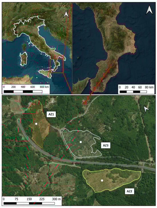 Sampled hazelnut groves (AZ1, AZ2 and AZ3) located between the municipalities of Torre di Ruggiero and Cardinale (Catanzaro), Calabria (Southern Italy). Satellite views (Google Earth) modified by QGIS software (https://qgis.org; version 3.34.2; accessed on 28 February 2024).
