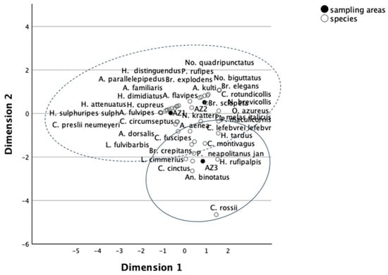 Correspondence of carabid species and subspecies vs. sampling areas in two sampling periods (2017–2018). Two groups are shown in figure, one for AZ3 (area circled with solid line) and another for AZ1 and AZ2 (area circled with dotted line).