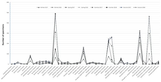 Temporal distribution of carabid species and subspecies in sampled hazelnut groves during 2017–2018.