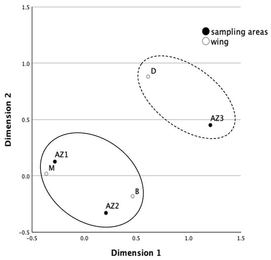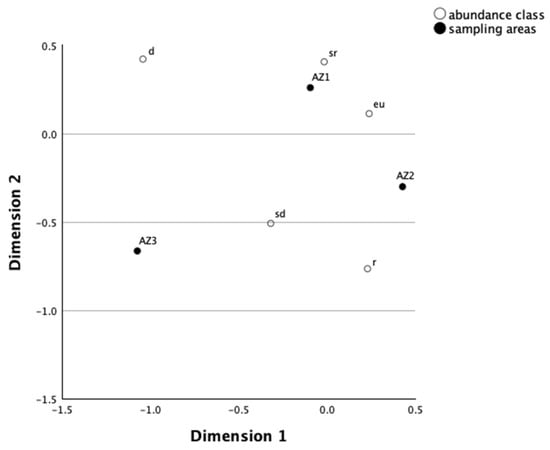Furthermore, the number of collected specimens in AZ3 differed significantly from those in AZ1 and AZ2 (Chi-square test = 1796.8; p < 0.001; df = 2). However, upon comparing the data from our study with those from other agricultural sites in Calabria [], the number and diversity of collected carabids in the sampled hazelnut groves was lower.