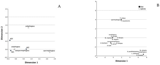 Zoophagous and zoospermophagous taxa were the most frequently encountered trophic preferences across all sampled groves. Additionally, a group of polyphagous taxa was identified along Dimension axis 1 (Figure 6B), including B. sclopeta, A. parallelepipedus, La. cimmerius, and Olisthopus fuscatus Dejean, 1828. The spermophagous group included species such as Ps. rufipes and Parophonus maculicornis (Duftschmid, 1812). The zoophagous group was represented by An. dorsalis, B. crepitans, Brachinus elegans Chaudoir, 1842, and Asaphidion flavipes (Linnaeus, 1760). The zoospermophagous group included Am. familiaris, Am. aenea, Am. fulvipes, and Amara kulti Fassati, 1947. Among the various trophic preferences observed in hazelnut carabid communities, generalist predators (zoophagous) and opportunistic zoospermophagous taxa were apparently the dominant categories.