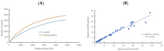 The adequacy of the data used for the study directly affects the accuracy of the identified areas of endemism. To assess the completeness of the study data, a matrix analysis was performed using EstimateS v9.1 to construct species accumulation curves [42]. Additionally, a linear regression was fitted to assess the completeness of the data collection, using a logarithmic transformation of the number of individuals to species richness on a 0.5° grid [23,43].
