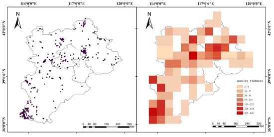Figure 2. Species distribution map and the pattern of species richness of Coleoptera in the Beijing–Tianjin–Hebei region.
