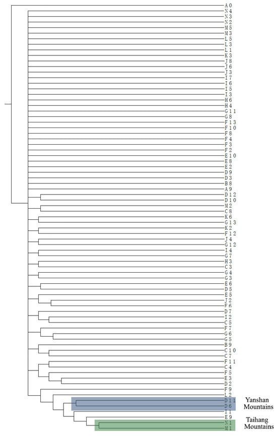 Different branching order maps were obtained using three different grid sizes: 0.1°, 0.25°, and 0.5°. Among these, the optimal tree under the 0.5° grid was selected as the marquee tree for the AOEs after ensuring strict consensus among the branch trees (Figure 3). From the marquee tree, two branches were selected that met the criteria. One branch belonged to the southern region of the Taihang Mountains (N1–M1), and the other branch belonged to the Yanshan region (D6–D11).