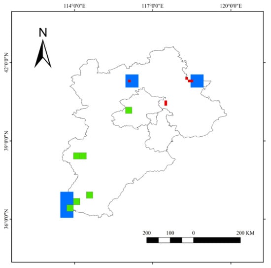 In the EA analysis, consensus regions were obtained using three different grid sizes: 0.1°, 0.25°, and 0.5°. By overlaying the consensus regions with the three grid sizes in Arc-GIS, a total of three AOEs were identified (Figure 5). These AOEs are associated with the Taihang Mountains Range, Yanshan Mountains Range, and Xiaowutai Mountains Range in Hebei Province. These identified consensus regions represent areas within the Taihang Mountains Range, Yanshan Mountains Range, and Xiaowutais Mountains Range that exhibit high levels of endemism for beetle species. Species scores within each consensus region are tallied in Supplementary Materials (Table S1).