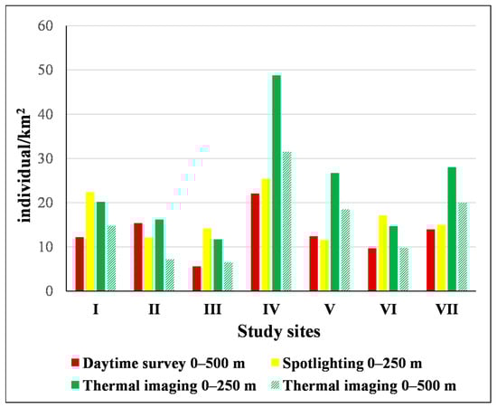 Four of the seven study sites had the highest absolute values obtained by the thermal imaging camera survey at the range of 0–250 m, while three of them achieved the highest value in the case of the spotlighting technique (within the same distance interval). At three hunting areas, the procedure of using the thermal camera in a larger spatial range (i.e., 0–500 m) also resulted in higher density values than those of spotlighting. Nevertheless, this type of estimation once provided the lowest density value, similar to spotlighting; however, that was true at five sites for daytime observations (Figure 3).