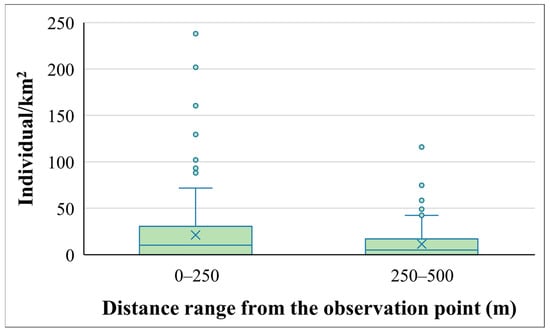 As already suggested by the results mentioned above, the estimated population densities by thermal camera observations were significantly higher when using the closer distance range similar to spotlighting (0–250 m) from the observation points than the data obtained beyond it, from the 250–500 m ring (Wilcoxon paired test: N = 132; W = 3593, p < 0.0001). The roe deer density was about two times higher when deer were checked in the shorter distance category than in the further one (Figure 4).