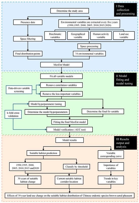 Our research framework is divided into data collection and processing, model fitting and tuning, and output and analysis of results (Figure 2). First, the required data are collected, and the necessary screening and resampling are performed to meet the research needs of this study. Then, the species distribution model for each year was established, and the model’s accuracy was optimized to obtain an accurate, suitable habitat distribution. Based on the analysis of the relationship between the suitable habitat and environmental variables in each year, the influence of the variables on the suitable habitat of the brown-eared pheasant was clarified. Finally, we identified critical corridors between the habitats of brown-eared pheasants to clarify current protection needs. This study applied ArcGIS Pro 3.2.2 and R-Programming (version 4.2.1) to all data extraction, modeling analysis, and mapping.