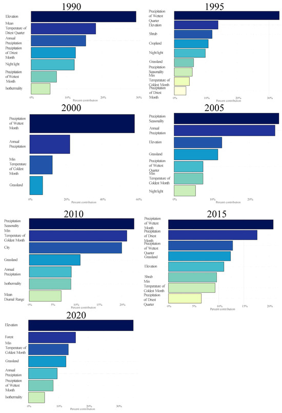 The total number of variables involved in the final fitting model of each year is at least four (2000), and the largest number of variables for a fitting model is nine (1995) (Figure 3). The importance of a single variable to the model is about 5~30% (Figure 3). Among the variables used in the fitting model of each year, the grassland and the min temperature of the coldest month were included in the model most frequently (seven times), followed by annual precipitation and elevation (five times) (Figure 3). It can be seen that changes in land use, temperature, and precipitation significantly affect the suitable habitat of brown-eared pheasants.