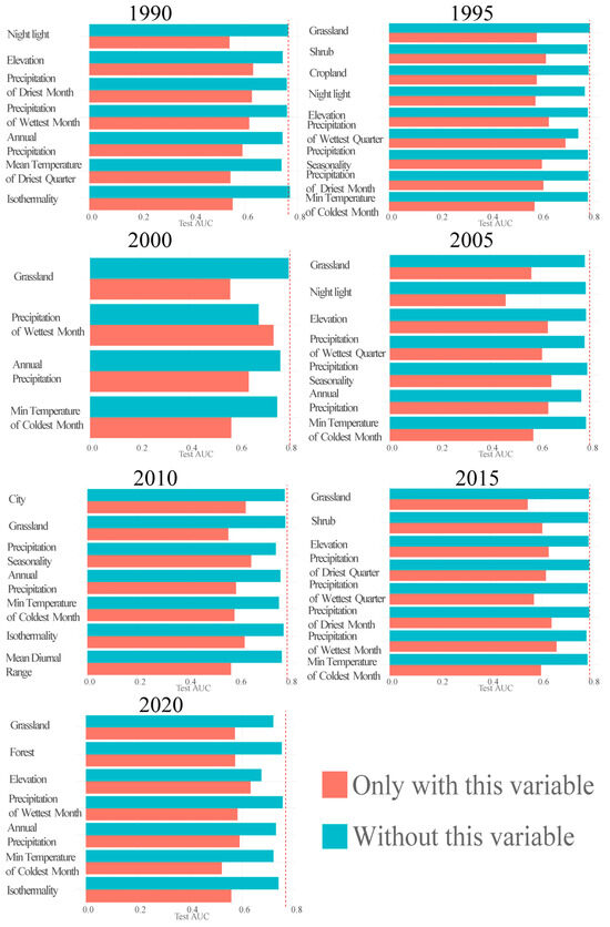 The jackknife test results indicated the relative importance of environmental factors on the distribution of the brown-eared pheasant in different years. The red dotted line represents the inclusion of all variables.