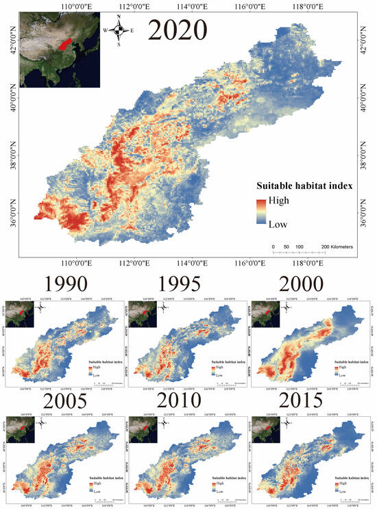 According to the final model parameters, we used the mean value of the output of the ten fold cross-validation model as the habitat suitability index of the brown-eared pheasant. We map the changes in the distribution of suitable habitats over the last three decades (Figure 5). The suitable habitat index of brown-eared pheasants fluctuated over 30 years, decreasing and gradually increasing from 1990 to 2020. Geographically, the habitat suitability of the western and central regions is generally higher than that of the eastern region. In the last 30 years, the suitable habitat in the central area of the distribution area gradually increased, and the degree of fragmentation gradually recovered. However, the distribution of suitable habitats in the eastern region is scattered and has not improved. The suitable habitat range of brown-eared pheasants in the west region (west of the Yellow River) is gradually increasing (Figure 5).