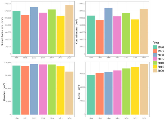 Changes in the area of suitable habitats, core habitats, grasslands, and brown-eared pheasant forests in the study area over the past 30 years.