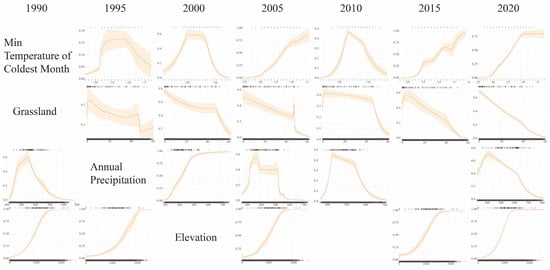 We draw the response curve for each variable in each year (Figure S1). The suitable habitat distribution in most of these years showed different degrees of response to grassland, the min temperature of the coldest month, annual precipitation, and elevation. Therefore, we focus on drawing the response curves of these four variables (Figure 7). The brown-eared pheasant showed a strong avoidance of grasslands, and the response curves for all years were negatively correlated. With the increase in the proportion of grassland area in landscape patches, the probability of brown-eared pheasants decreased. The optimal response range of the suitable habitat for the brown-eared pheasant to the min temperature of the coldest month is approximately −10 °C to −20 °C, and the optimal response range to annual precipitation is approximately 400~600 mm. With increasing elevation, the probability of the appearance of a brown-eared pheasant gradually increased.