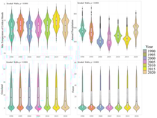 To clarify the critical factors for the change in suitable habitat for the brown-eared pheasant population between different years, we map the changing trend of the main variables at the landscape level (Figure 8). We examined discrepancies in the distribution of environmental variables between years (Figure S2) and found that the differences were highly significant. Because elevation does not change significantly over time, only changes in grassland, min temperature of the coldest month, and annual precipitation are drawn. To clarify the relationship between the distribution of suitable habitat for the brown-eared pheasant and the change in forest area, we also map the change in forest area at the landscape level in the study area between different years (Figure 8).