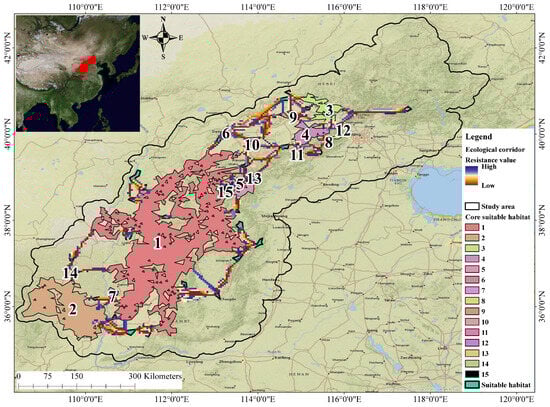 In this study, 15 brown-eared pheasant core habitats were identified (Figure 9), of which the largest core habitat was Shanxi Province in the middle of the study area, indicating that Shanxi Province is the core area of the brown-eared pheasant distribution. The second largest core habitat is located in northern Shaanxi Province. The remaining core habitats are scattered, and the area is significantly reduced. In general, the distribution of the core habitat in the northeast of the study area is severely fragmented.