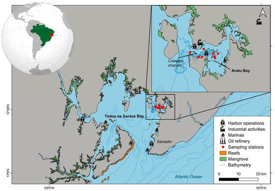- Barros, F.; Costa, P.C.; Cruz, I.; Mariano, D.L.S.; Miranda, R.J. Habitats Bentônicos na Baía de Todos os Santos. Rev. Virtual Quim. 2012, 4, 551–565. [Google Scholar] [CrossRef]