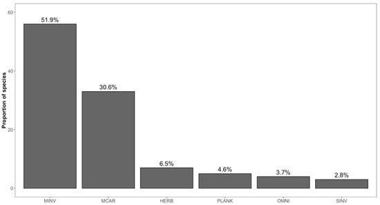- Oliveira, R.L.; Moraes, L.E.; Santos, A.C.d.A. Diet composition of abundant fish species in the shallow waters of the Todos os Santos Bay, Bahia, Brazil. Acta Scientiarum. Biol. Sci. 2021, 43, e52230. [Google Scholar] [CrossRef]