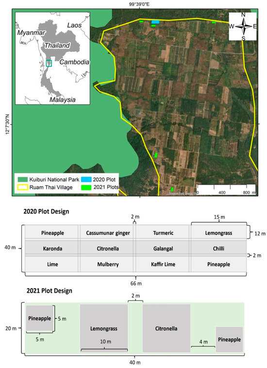 Study site. Top: Kuiburi National Park in southwestern Thailand borders the study site, Ruam Thai Village, where elephant activity was monitored in six test plots located within 125 m from the forest edge. Bottom: The 2020 test plot (1.7 rai/2640 sq m) contained 10 experimental crop species planted in equally sized sub-plots. The five 2021 test plots (0.5 rai/800 sq m) contained lemongrass and citronella. Pineapple was planted in all test plots for comparative analysis. The 2020 test plot and five 2021 test plots were monitored for 22 months and 12 months, respectively.