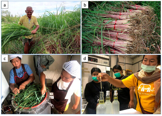 Harvesting and processing stages. (a) Mature citronella leaf yield is harvested from the 2020 test plot using a sickle. (b) Stalk yield is then unearthed, cleaned, and tied in bundles containing equal stalks in preparation for sale or replanting. (c) An industrial hydrodistillation machine is used to extract essential oil from leaf yield. (d) The essential oil, valuable, concentrated oil extracted from plant matter is separated from hydrosol, a diluted byproduct from the distillation process that can be used in cosmetic and aromatherapy products.