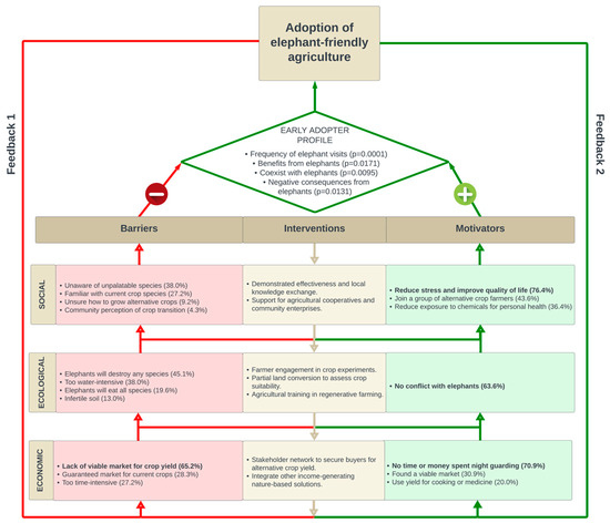 Early adopter profile. The profile of an early adopter, a farmer most interested in elephant-friendly agriculture, is shaped by four parameters determined from the household survey responses. Farmers experience barriers and motivators in social, ecological and economic domains, and the presence and absence of both barriers and motivators affects interest in elephant-friendly agriculture. The interventions in each domain are key to minimizing the barriers and maximizing the motivators, so more farmers adopt and experience success, which contributes to the positive feedback loop that enables more widespread adoption. Barriers and motivators in bold were reported by the majority of participants.