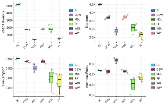 Alpha diversity indices of the protist communities in the sites of Shulgan-Tash Cave and the outer Blue Lake: Chao 1, Shannon, Gini-Simpson, and Pielou’s evenness. The points on the plot correspond to the individual samples and are colored according to the different sites: PF—pool finger biofilm; CEW—lake water at the point of inflow into Distant Lake; WPF—water surrounding pool fingers; WDL—water in the middle of Distant Lake; MDL—mats of Distant Lake; BL—water from Blue Lake.