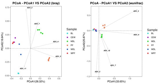 2D plots based on the results of principal coordinate analysis (PCoA) of the protist communities using Bray–Curtis (left) and the weighted UniFrac (right) distances. PCo1 (Axis 1) and PCo2 (Axis 2) explained 33.65% and 25.8% of the protist community variance at the ASV level, respectively. PF—pool finger biofilms; CEW—lake water at the point of inflow into Distant Lake; WPF—water surrounding pool fingers; WDL—water in the middle of Distant Lake; MDL—mats of Distant Lake; BL—water from Blue Lake.
