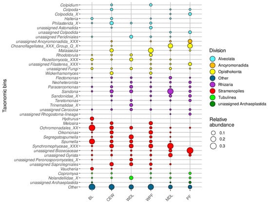 A total of 9 supergroups of eukaryotes, 16 divisions, 23 subdivisions, 61 classes, 133 orders, 186 families, and 272 genera were identified, except for unidentified taxa (Figures S2–S8). However, the following discussion focuses only on protist taxa (ASVs) represented by more than 1% of the reads, namely 5 supergroups, 8 divisions, 12 subdivisions, 24 classes, 31 orders, 33 families, and 32 genera (Table S2). The taxonomic structure of the protist communities at the genus level and at higher taxonomic levels demonstrated similar patterns. In all biotopes, the most abundant supergroups were Obazoa, represented primarily by Opisthokonta, and TSAR, mainly represented by Stramenopiles, Alveolata, and Rhizaria (Figures S2 and S3; Table S2). Blue Lake (BL) had a significantly higher proportion of Archaeplastida compared to the other sites (PF, MDL, CEW, WPF, WDL) (Figure S2; Table S2).