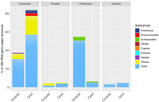 We investigated the functional diversity of protists in Blue Lake and inner cave sites, based on the relative abundance of consumers, phototrophic organisms, and parasites (Figure 6 and Figure S11). Out of all, 1118 (69%) ASVs were classified as consumers, 250 (15.5%) as phototrophs, 139 (8.5%) as parasites (including some predatory protists), and 114 ASVs (7%) were assigned to unknown categories due to their unclear functional roles. Consumers were prevalent (84.8%) in the Distant Lake communities, whereas phototrophic and parasitic groups had minor proportions (5.3% and 4.5%, respectively) (Figure 6). Phototrophic protists were prevalent in the plankton community of Blue Lake (55%), although consumers were also widely represented (37.2%). Parasites were equally abundant in communities inside the cave (4.4%) and in Blue Lake (4.5%) and were mostly represented by parasitic Peronosporomycetes (Gyrista) and Rozellomycota (Fungi). Consumers were represented mainly by the supergroup TSAR and its division Stramenopiles. Phototrophic protists were mostly from the division Stramenopiles (TSAR) and from the division Chlorophyta (supergroup Archaeplastida) with a smaller proportion.