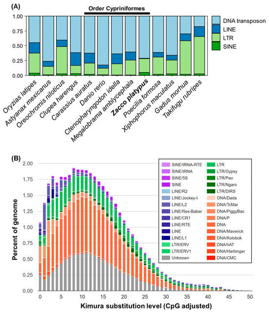 - Shao, F.; Han, M.; Peng, Z. Evolution and diversity of transposable elements in fish genomes. Sci. Rep. 2019, 9, 15399. [Google Scholar] [CrossRef]