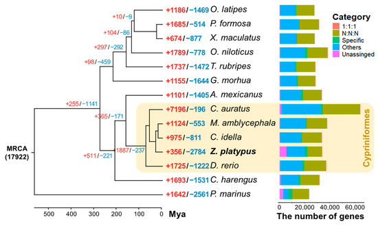 - Robinson-Rechavi, M.; Marchand, O.; Escriva, H.; Bardet, P.L.; Zelus, D.; Hughes, S.; Laudet, V. Euteleost fish genomes are characterized by expansion of gene families. Genome Res. 2001, 11, 781–788. [Google Scholar] [CrossRef]