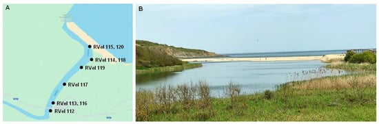 - Next to a sandbar between the river and the sea—samples with numbers RVel2021/115 and RVel2021/120 (GPS coordinates: 42.066845, 27.971472). The river bottom in the region is sandy and the main vegetation is common reed (Phragmites australis).