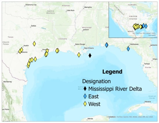 Map of collection sites of Palaemon spp. used in this study. The Mississippi River Delta is indicated to show the dividing point set for this study, and other collection sites are labeled as coming from east or west of this point.
