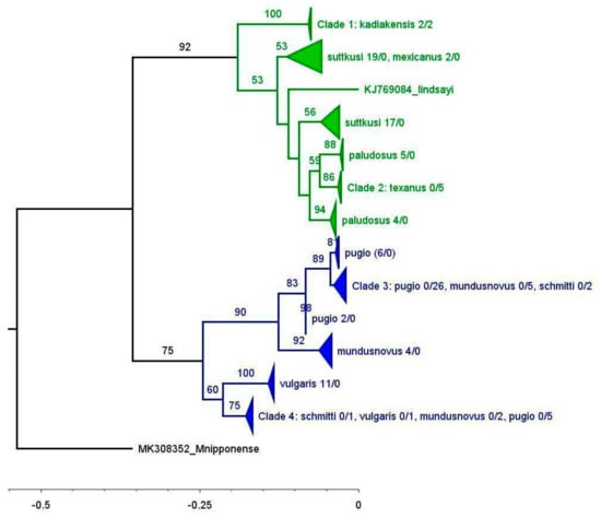 - Leigh, J.W.; Bryant, D.; Nakagawa, S. POPART: Full-feature software for haplotype network construction. Methods Ecol. Evol. 2015, 6, 1110–1116. [Google Scholar] [CrossRef]