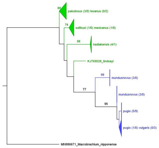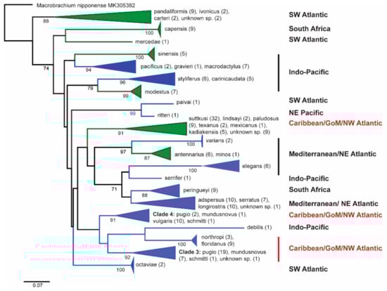 Maximum Likelihood tree of publicly available Palaemon COI sequences and COI sequences generated for this project (COI−NCA tree) from North/Central America. Triangles and flat lines indicate compressed subtrees; values within parentheses indicate the number of collected and public sequences in each subtree in the particular format (publicly available/generated in this study). Saltwater Palaemon species are colored blue; freshwater species are shown in green. The scale indicates relative node ages. Values at the nodes indicate bootstrap support (500 replicates).