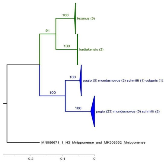 3.4. Analysis of Concatenated COI and H3 Sequences from North America (COI-H3-NA)