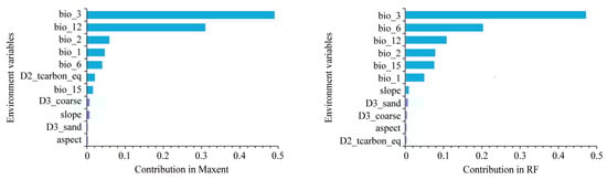 This study identified 11 primary environmental factors that significantly influenced the distribution of D. dyeriana (Figure 2). The permutation importance of the two models was different. In the MaxEnt model, climatic variables, soil factors, and topographic factors contributed 96.30%, 2.90%, and 0.80%, respectively. Among these, bio_3 (Isothermality) and bio_12 (Annual Precipitation) were the two most important factors for the distribution of D. dyeriana, with contribution rates of 49.10% and 31.00%, respectively, while the contribution rates of other environmental factors were all less than 10% (Figure 2).