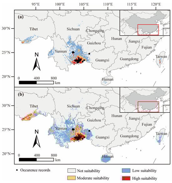 In SSP3-7.0 scenario 2050, the highly suitable areas in the MaxEnt model were mainly in the eastern parts of Yunnan, like Wenshan and Honghe, with a high habitat suitability area of 2.97 × 104 km2 (Figure 7). By 2090, the area of high suitability decreased, and moderately suitable areas had emerged in the central and eastern parts of Yunnan and southern Tibet. The model in 2090 predicted that the moderately suitable area was the largest among all scenarios, covering an area of 8.46 × 104 km2. However, results from the RF model predicted that the highly suitable areas were mainly concentrated in Wenshan, Honghe, and Qujing in Yunnan, covering an area of 3.84 × 104 km2, representing the largest highly suitable areas among all future scenarios. The model, however, predicted that by 2090, a large part of the highly suitable area would disappear, leaving sparse distribution in Kunming, Qujing, and Honghe, with a remaining range of 1.24 × 104 km2 (Table 3). Although the overall distribution range of suitable habitats is expected to increase significantly, most areas are low habitat suitability zones.